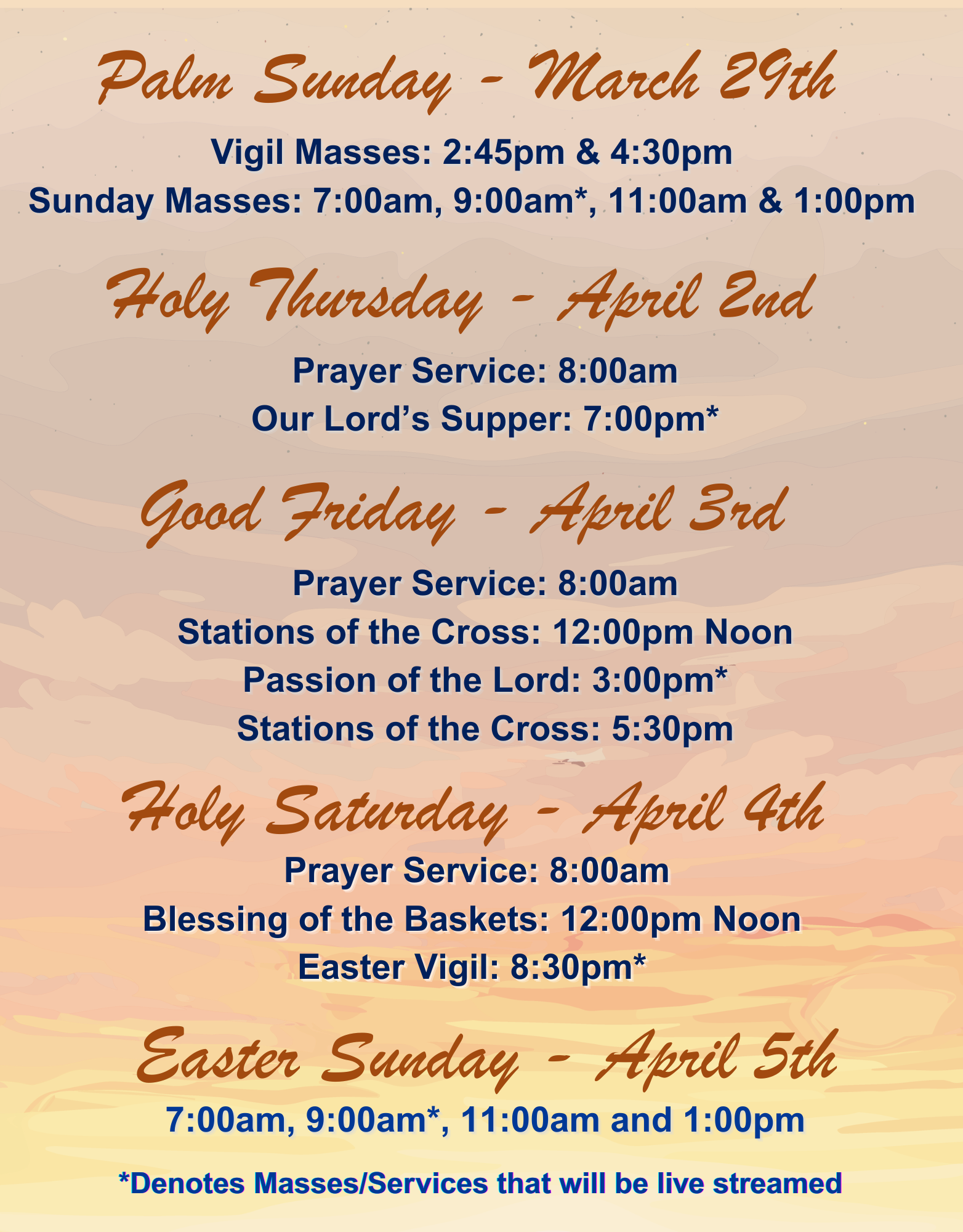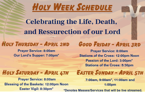 8:00 am & Vigil Mass 2:45pm & 4:30 pm
