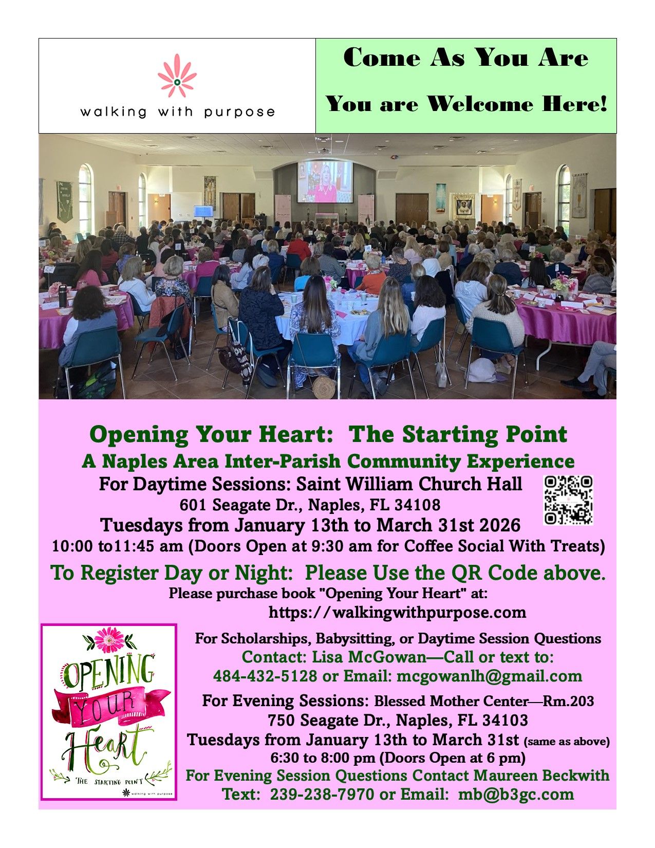 6:30pm-8:00pm (doors open at 6:00pm) for our evening sessions at the Blessed Mother Center